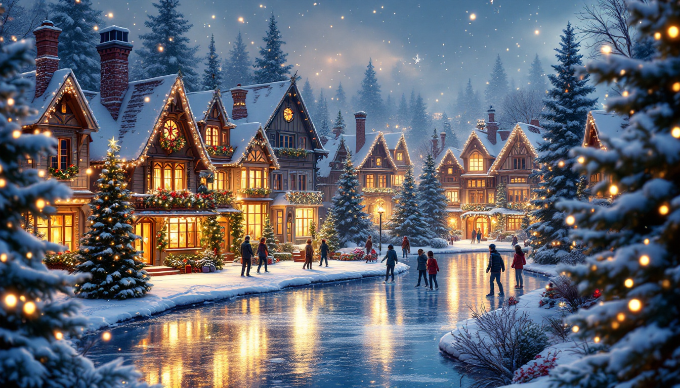 - Prompt Used: “Snowy Christmas village at night, warm glowing windows, people skating on a frozen pond, decorated pine trees, twinkling fairy lights, cinematic winter scene, festive and joyful, ultra detailed, anime style”