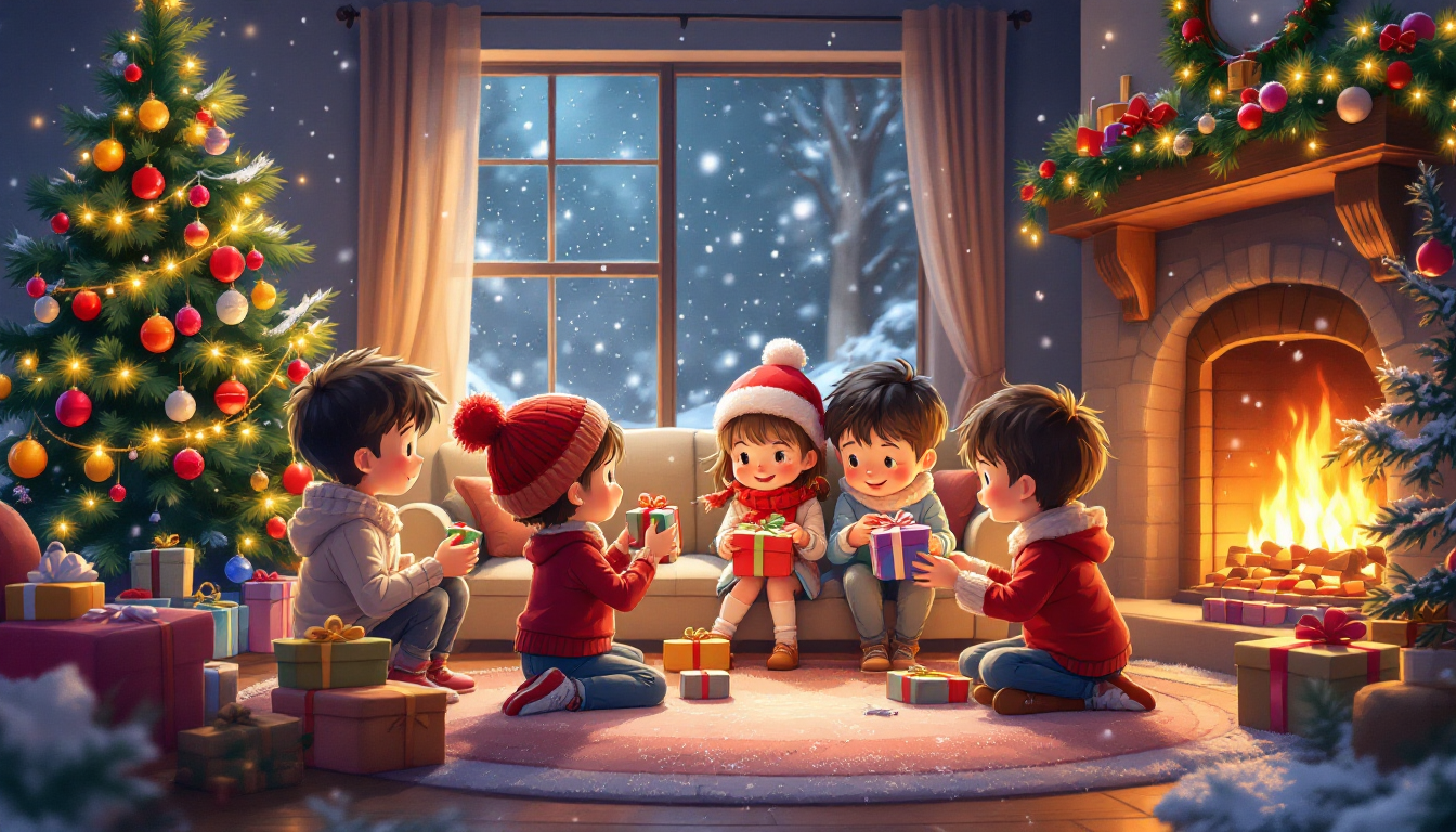 - Prompt Used: “Anime-style Christmas party scene, children exchanging gifts, Christmas tree decorated with ornaments and lights, cozy fireplace, falling snow outside the window, warm festive lighting, cheerful and detailed, vibrant colors”