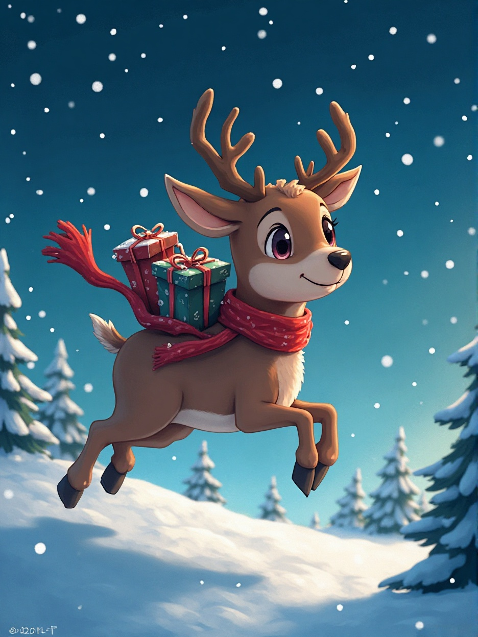 - Prompt Used: “Cute anime reindeer wearing a red scarf, carrying presents on its back, jumping over a snowy forest, starry night sky, twinkling lights in the background, magical Christmas feeling, high detail, soft lighting”