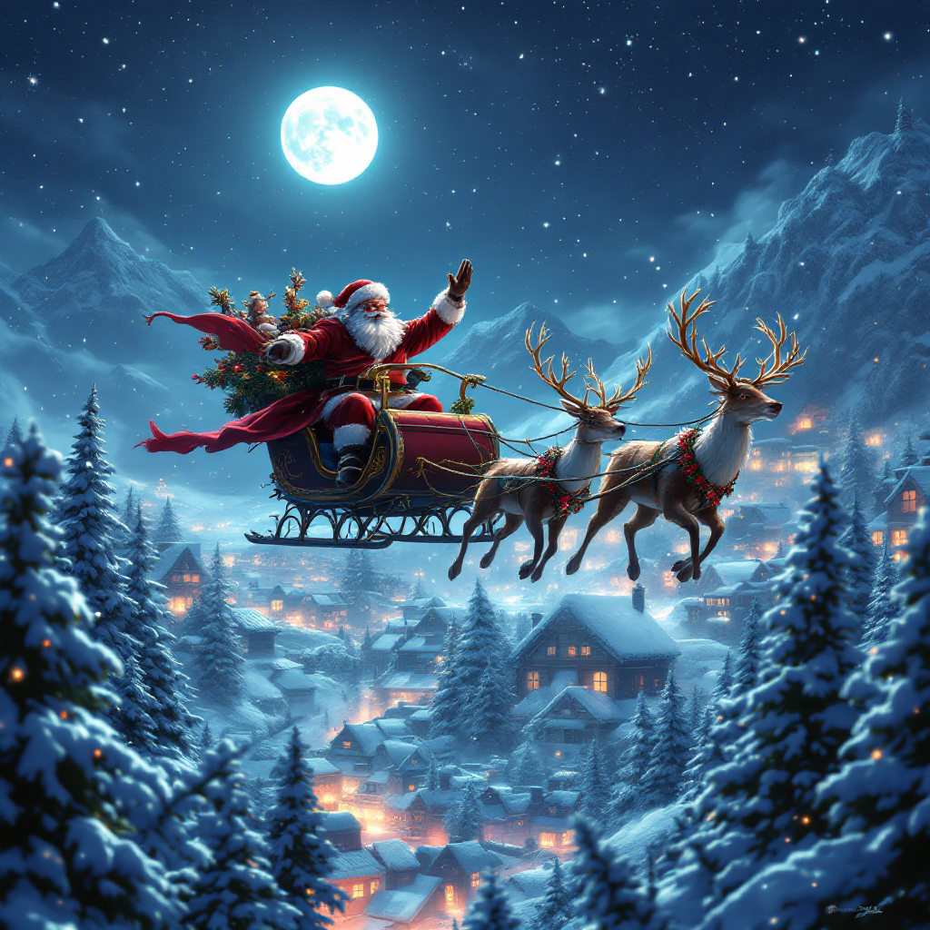 Santa Claus flying over snow-covered town in a sleigh pulled by reindeer, twinkling stars and moonlight, cinematic perspective, ultra detailed