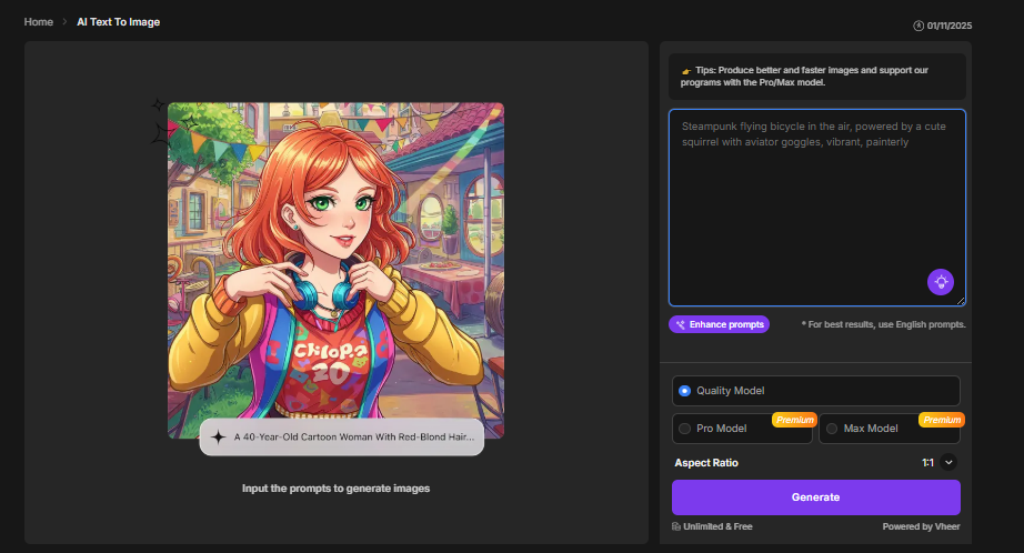 Vheer‘s free online text-to-image tool allows you to generate high-quality images simply by typing a prompt. There’s no signup, no watermark, and no usage limits, making it suitable for beginners and professionals alike.