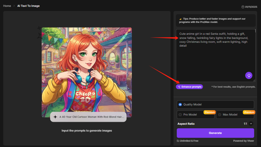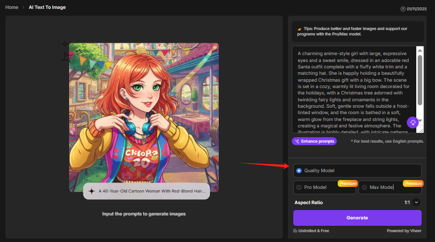 Vheer offers multiple models: Quality (free), Pro (paid), and Max (paid). To create free Christmas illustrations, keep the Quality option selected.