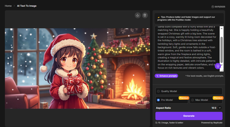 If you don’t have a clear idea, you can simply type “Christmas illustration” and then click the tool’s “Enhance Prompts” feature. This built-in function will automatically refine your basic description, adding creative details and helping you generate a more imaginative and polished prompt.