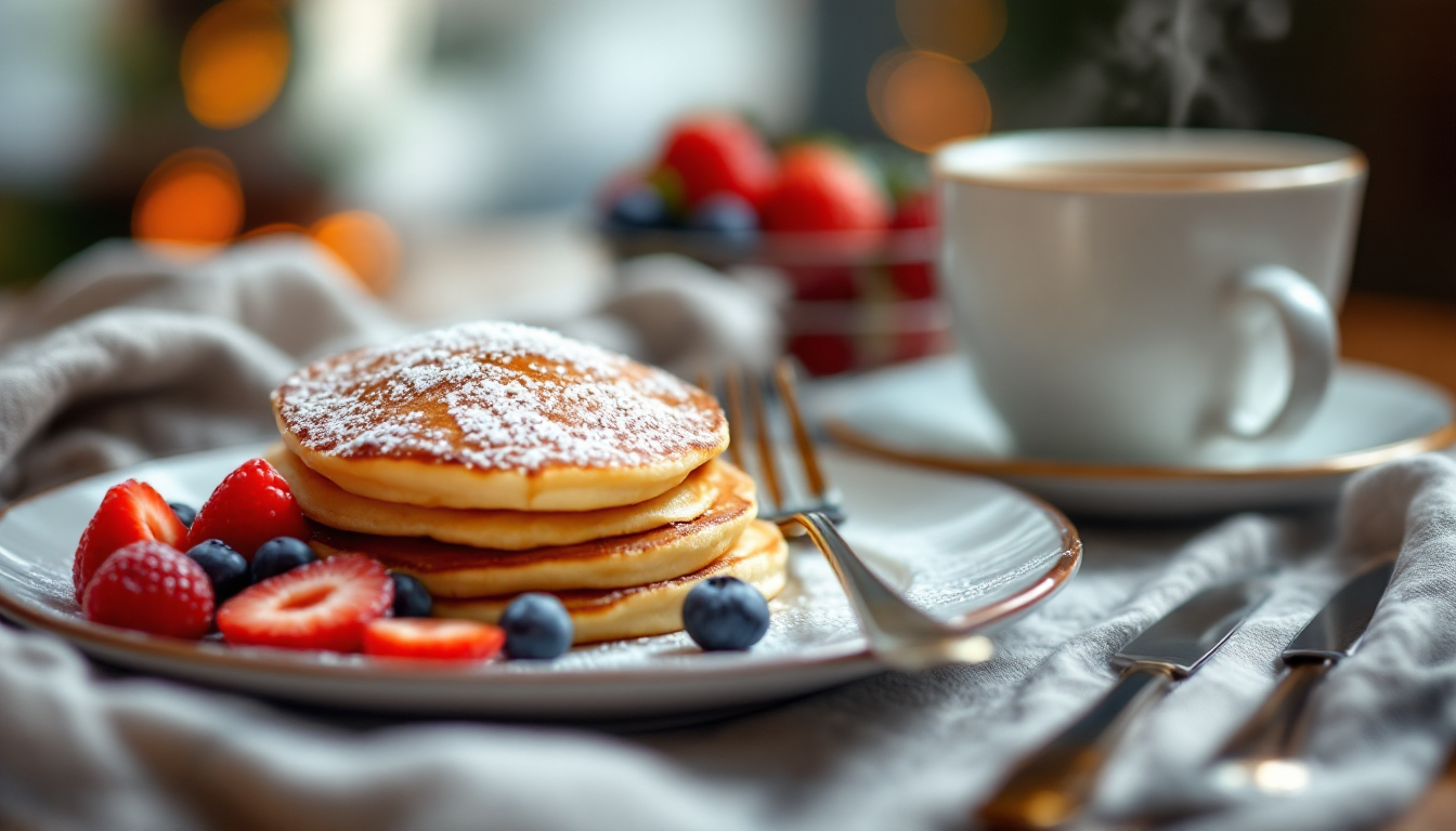 Prompt used: Close-up of a gourmet breakfast plate with pancakes, fresh berries, and coffee, soft natural lighting, cozy and inviting, 16:9 blog header