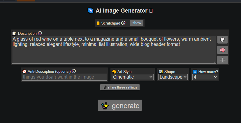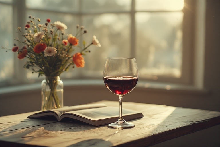Prompt used: A glass of red wine on a table next to a magazine and a small bouquet of flowers, warm ambient lighting, relaxed elegant lifestyle, minimal flat illustration, wide blog header format