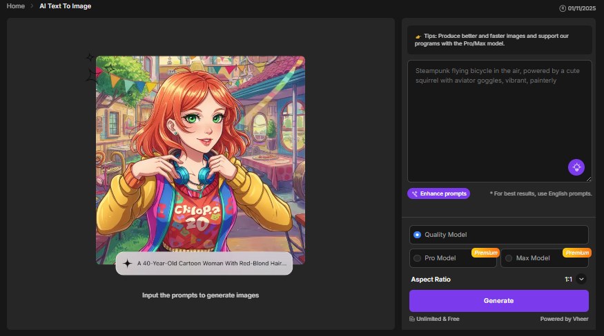 - If you are not good at writing prompts, just type the rough ideas and hit Enhance Prompts feature to let Vheer automatically optimize and complete your ideas.
