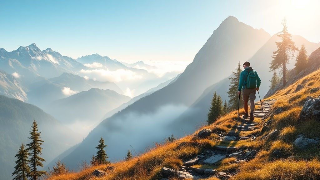 Prompt used: Scenic mountain trail with hiker, misty morning light, adventure and exploration theme, flat illustration, wide blog header