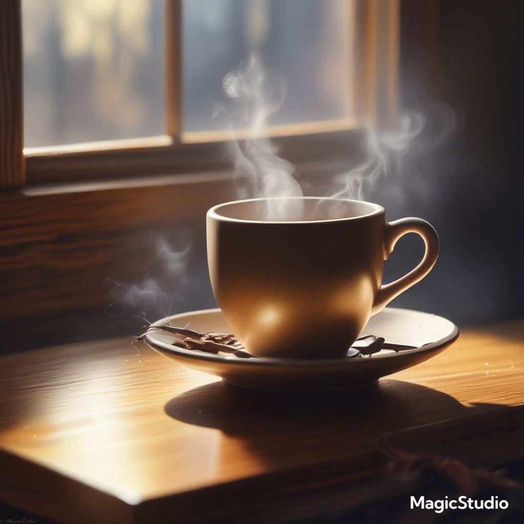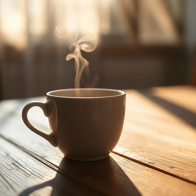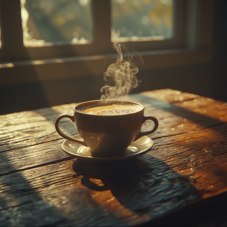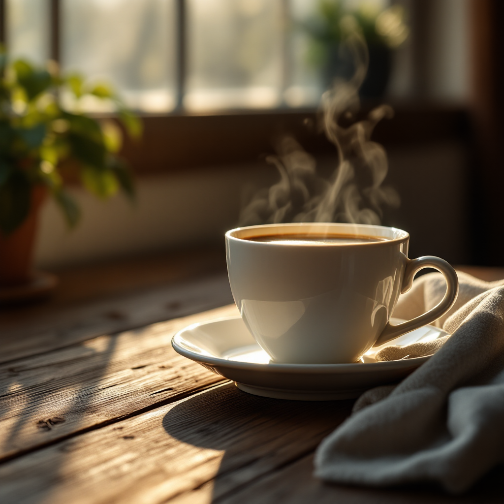 - Prompt used: Close-up of a steaming cup of coffee on a wooden table, morning sunlight streaming through the window, realistic textures, natural shadows