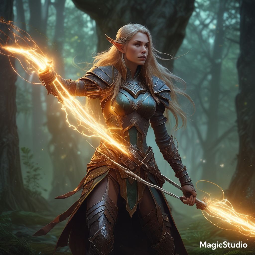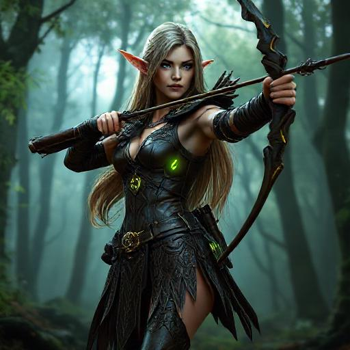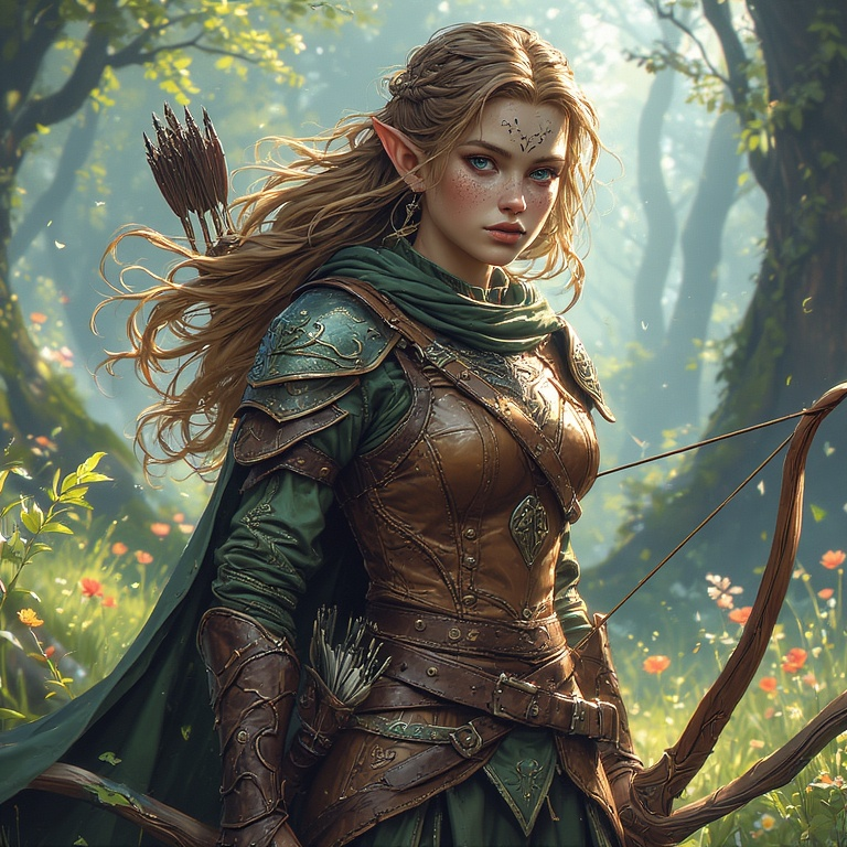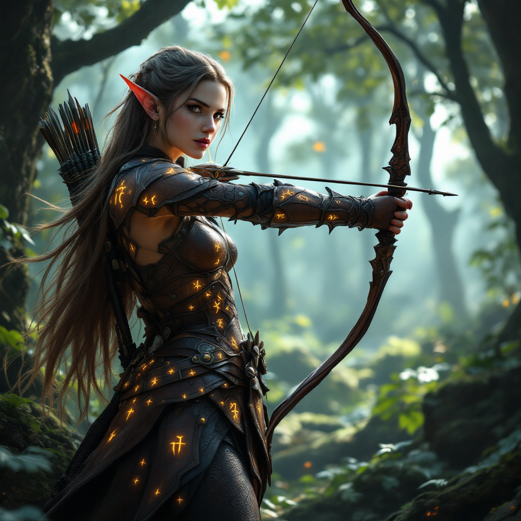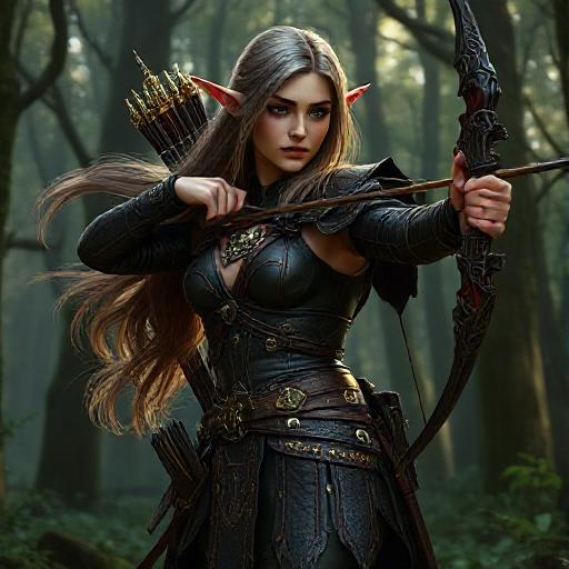 - Prompt used: High-quality game concept art of a female elf archer, intricate leather armor with glowing runes, long flowing hair, standing in an enchanted forest, dynamic pose, cinematic lighting, realistic 3D rendering