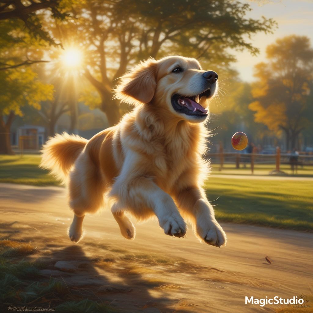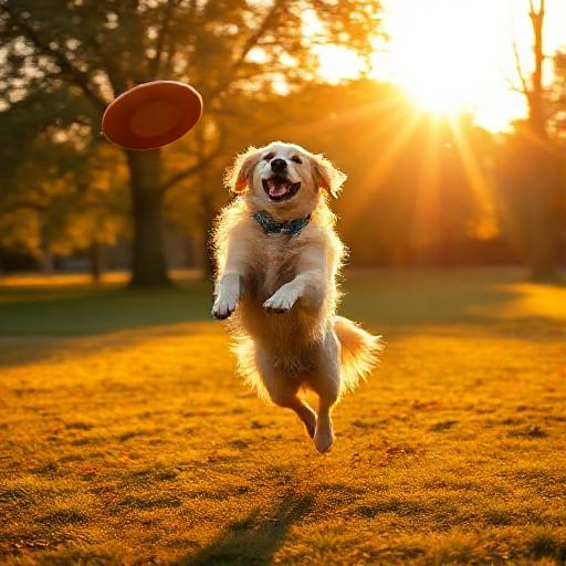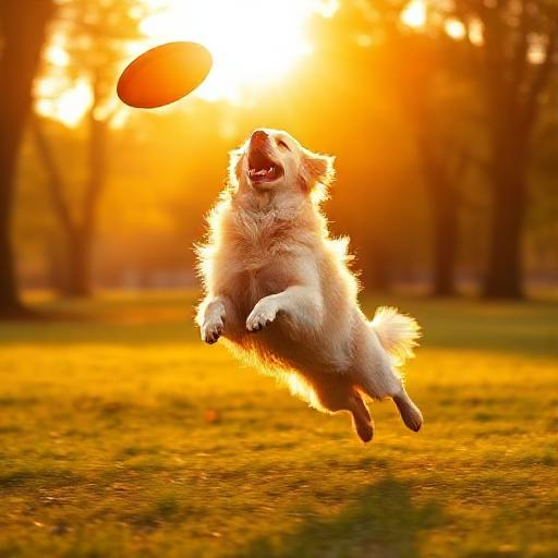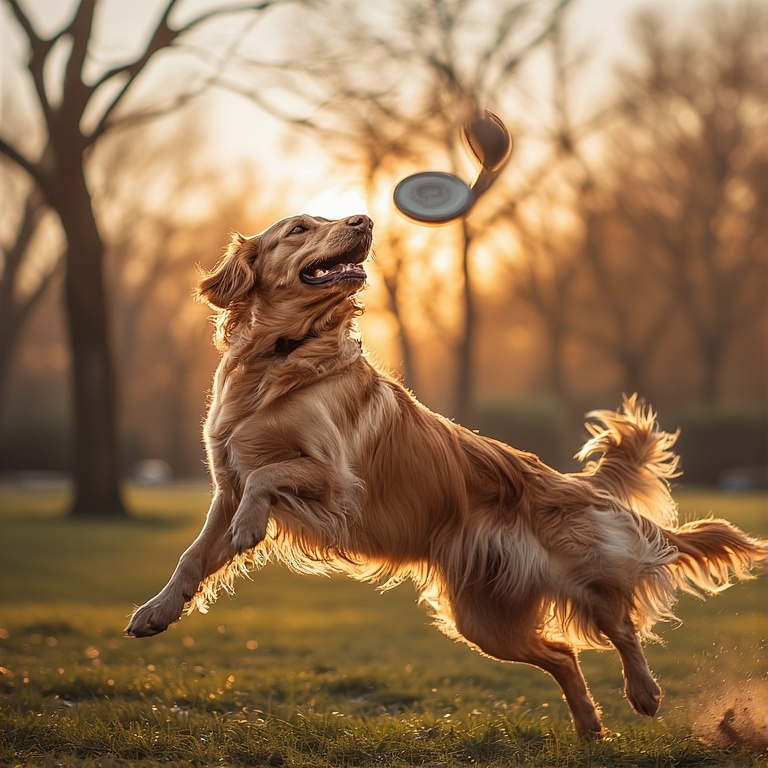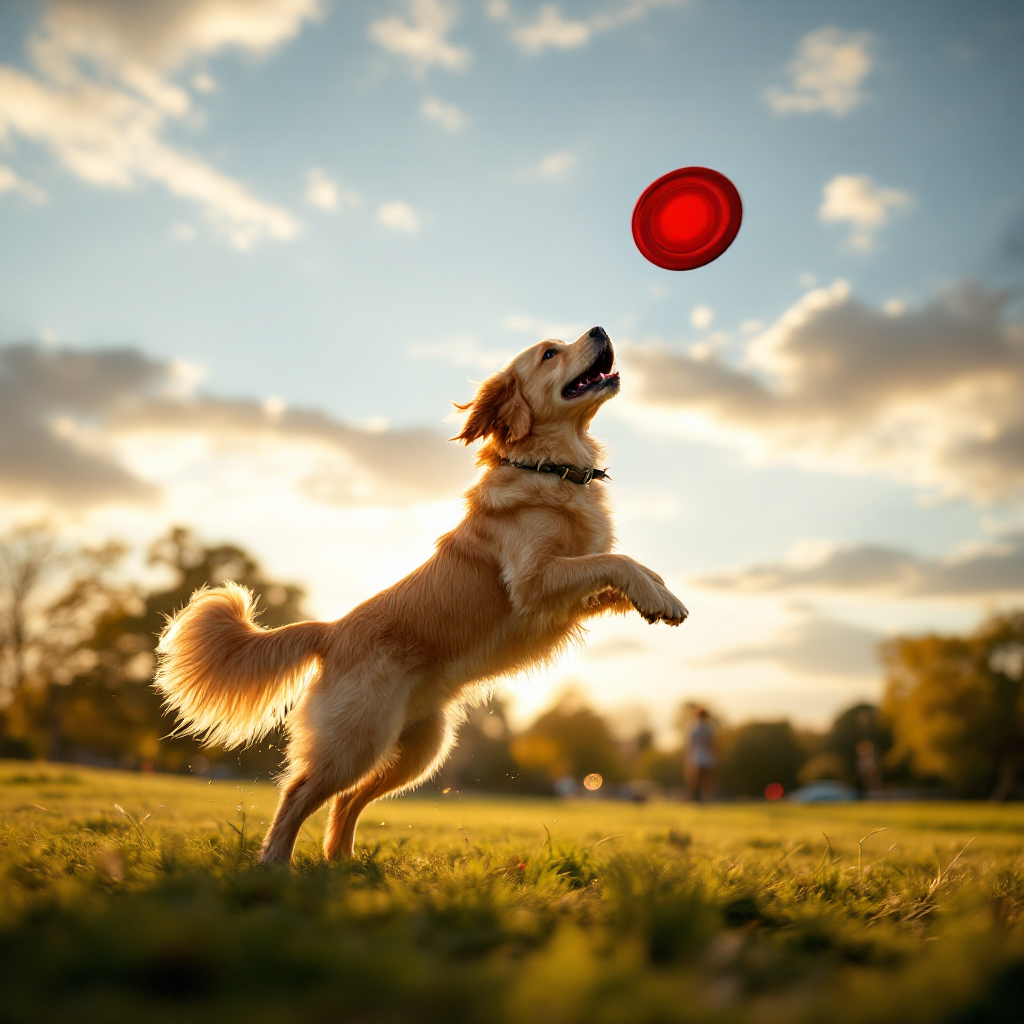 - Prompt used: Golden retriever leaping to catch a frisbee in a park during golden hour, motion blur, ultra-realistic fur and sunlight reflections