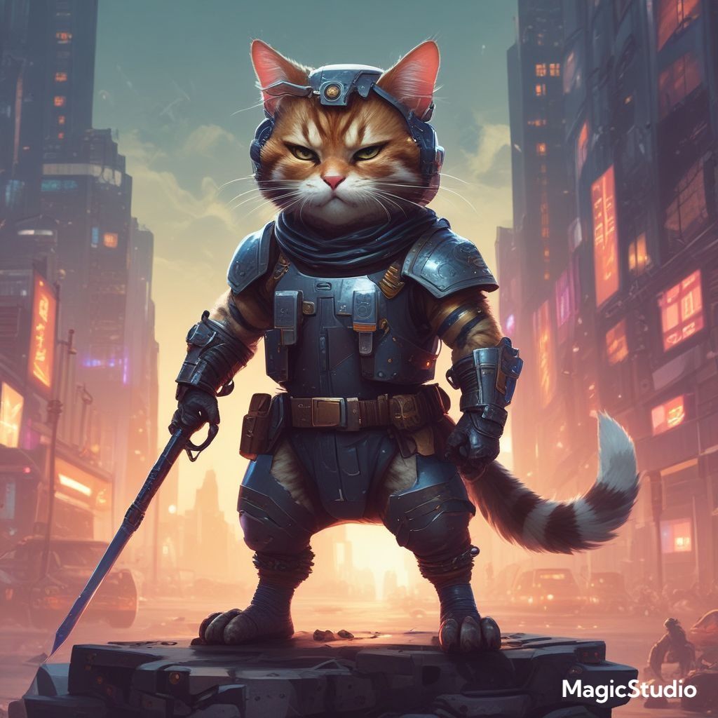Prompt used: a cute cat warrior wearing a cyberpunk uniform