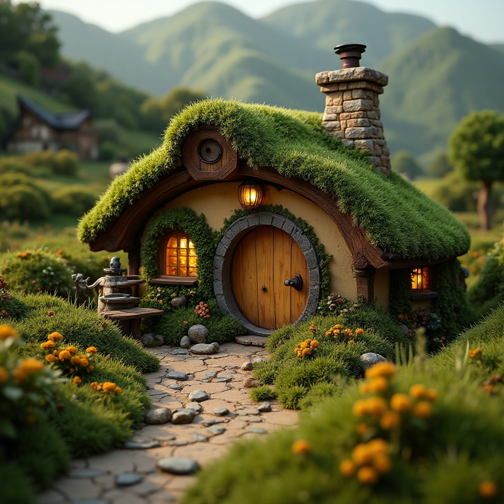 Miniature World Elements: a hobbit-style home built into a hill with round doors and mossy roof