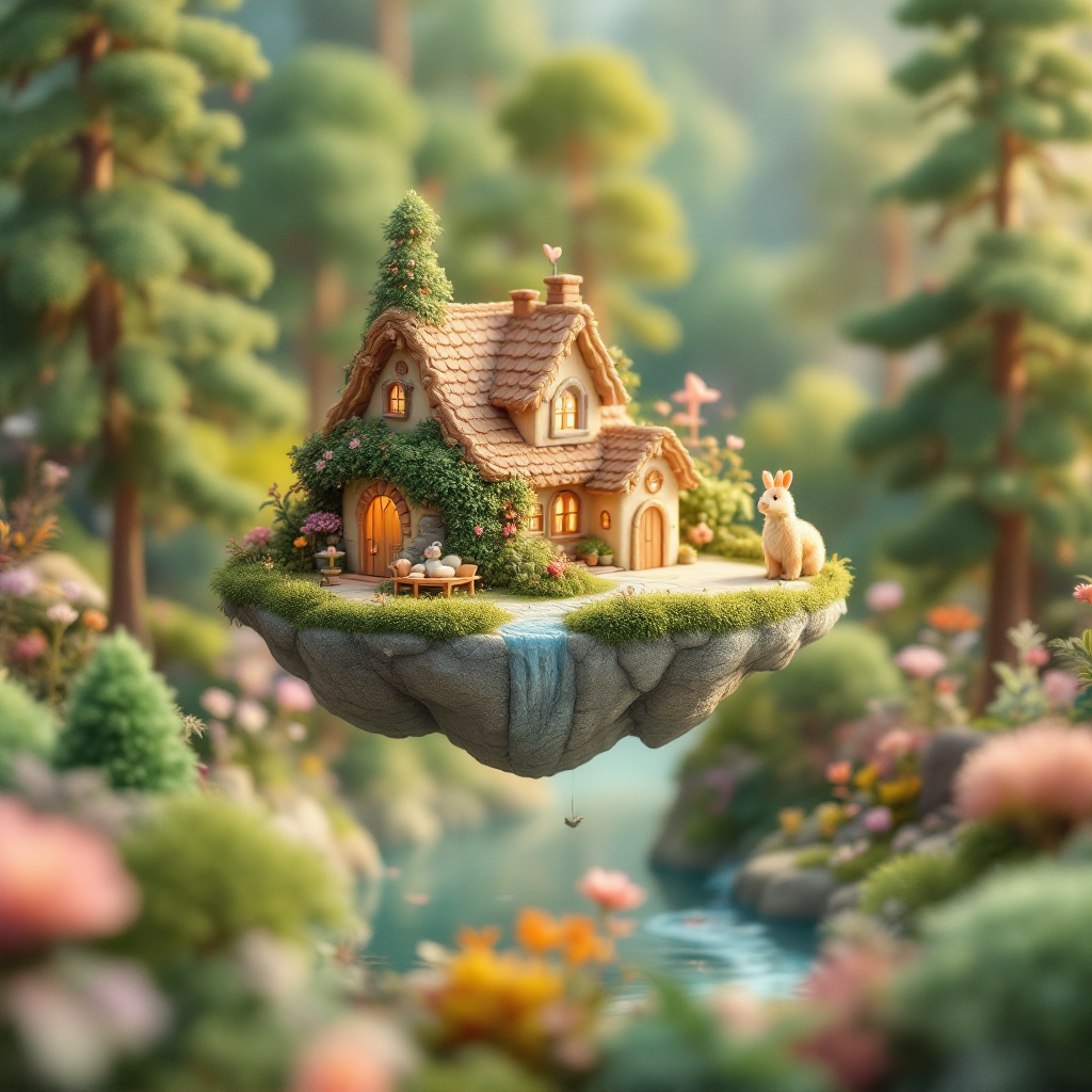 | Miniature World Elements | Main objects/scenery | “Floating island with tiny houses and trees” |