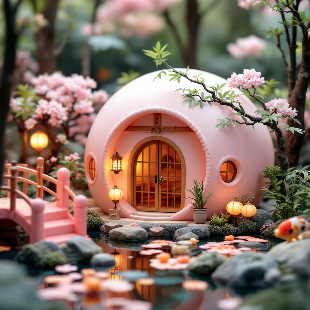 Miniature World Elements: round pastel home shaped like a dango with bamboo details