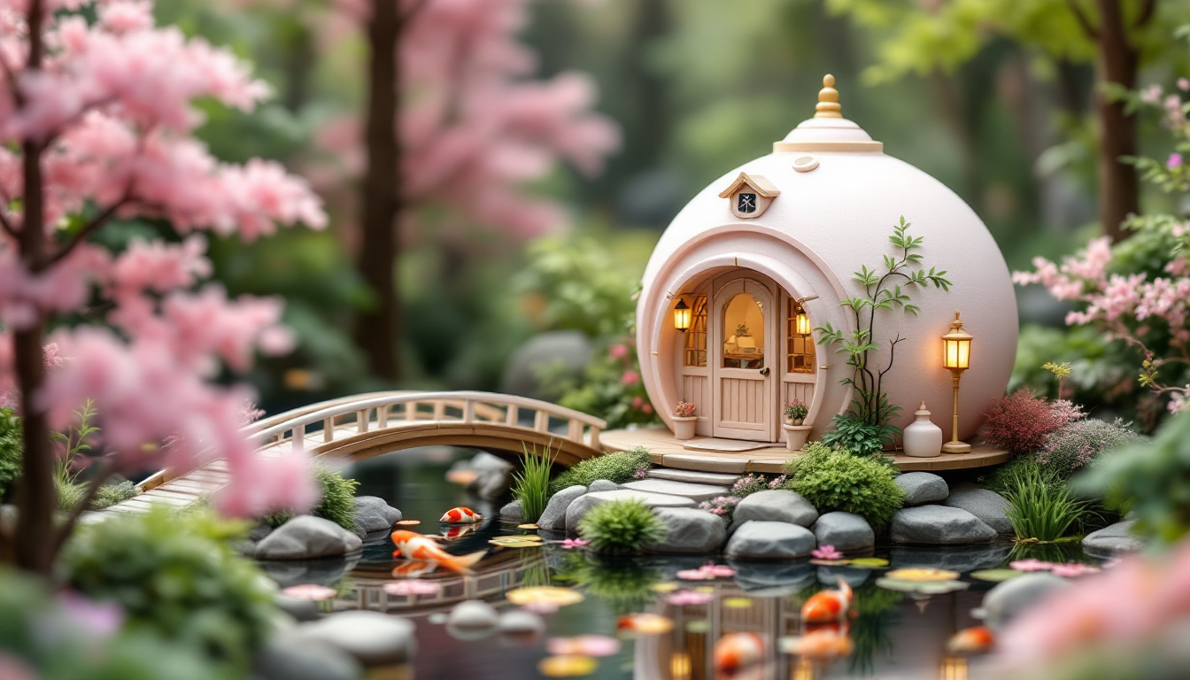Miniature World Detail: traditional bridge, pink-white palette, lanterns and nature blending