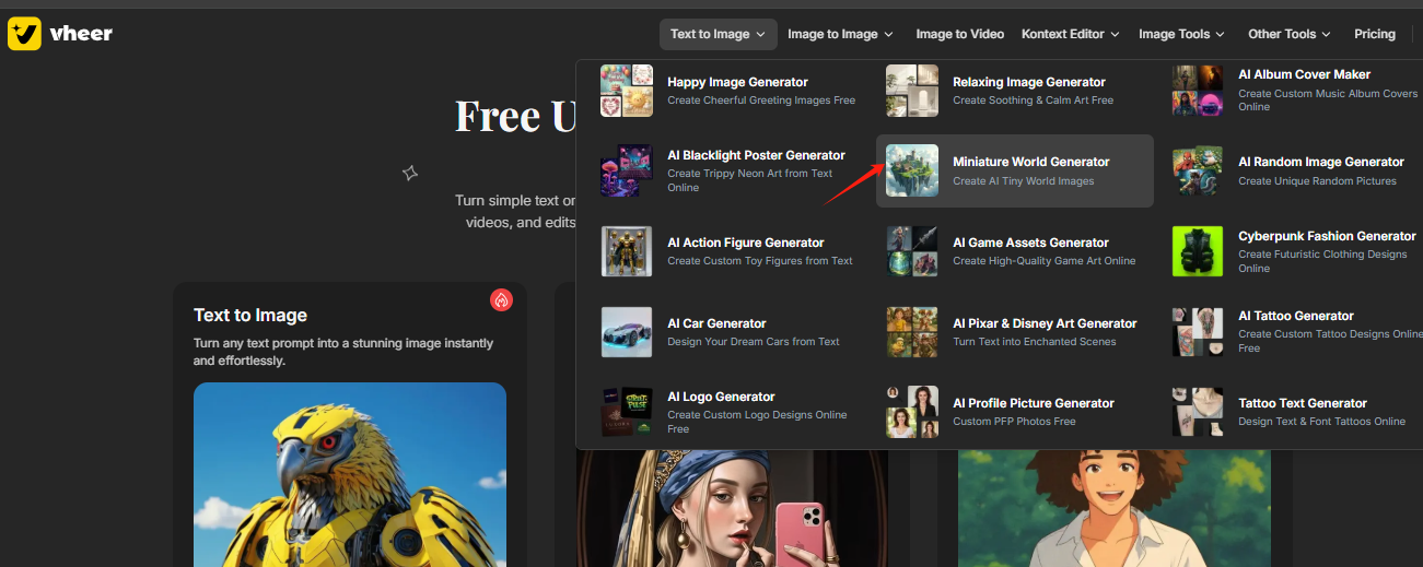 Go to the Vheer AI website and navigate to the Miniature World Generator from the main menu or tool list. Click the tool name to enter the image generation page.