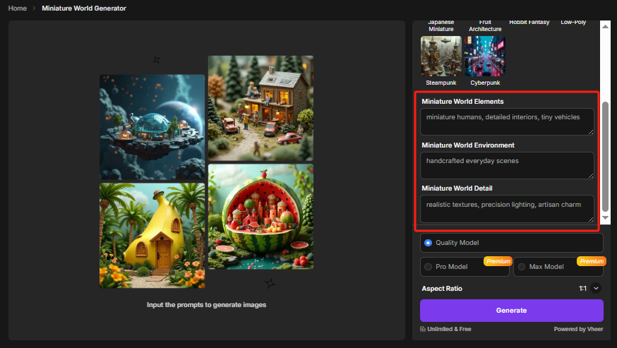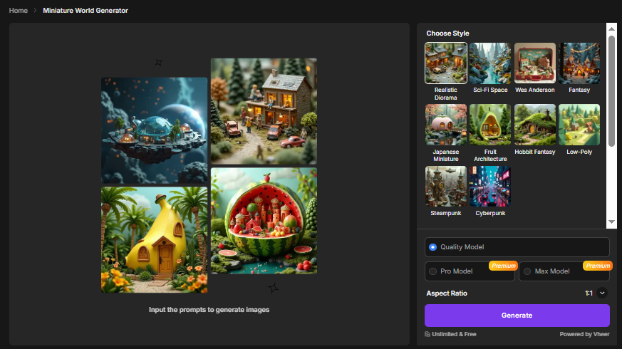 Vheer provides a selection of specialized miniature world styles such as Fantasy, Sci-Fi Space, Steampunk, Japanese Miniature, Wes Anderson-inspired, Low-Poly, Cyberpunk, and more. Each style helps you match a different creative direction instantly.